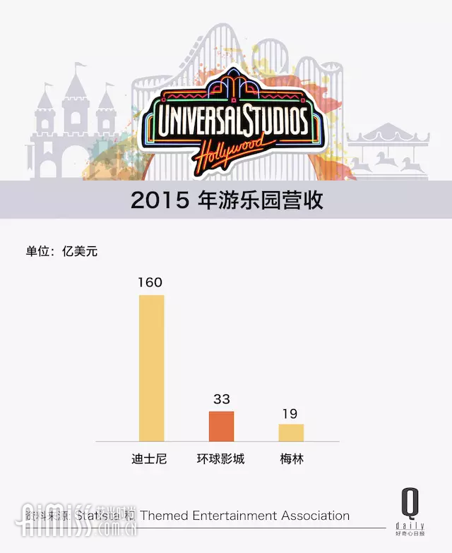 联合大众的力量背后有它的无奈,因为主题乐园的市场上,迪士尼乐园看起来无人能敌,2015年迪士尼乐园160亿美元的营收,差不多是环球影城的5倍。王健林把迪士尼称为全球最大的旅游公司就是这个原因。
