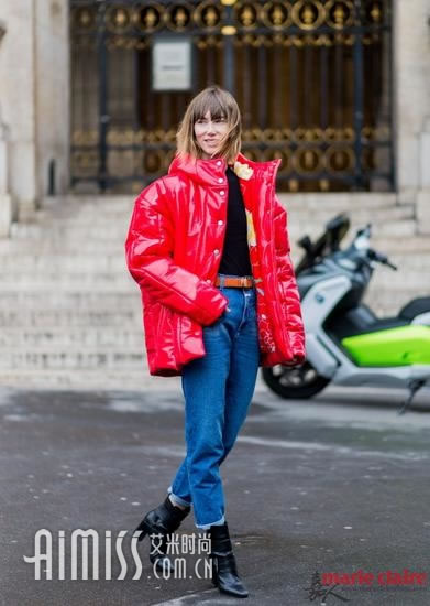 Anya Ziourova身穿红色AWAKE宽肩羽绒服,下身穿直筒牛仔裤,看着很简单但是这种搭配绝对是今年开春时比较流行的搭配,并且这样的装扮还很百搭。